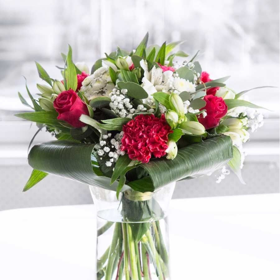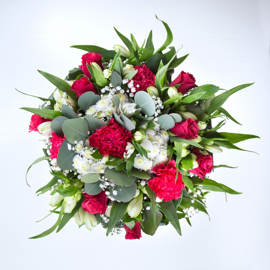 Delight in the unique charm of our mixed flower bouquet, designed to captivate and inspire. Featuring rich red roses paired with sweet white chrysanthemums, complemented by delicate gypsophila and vibrant carnations.